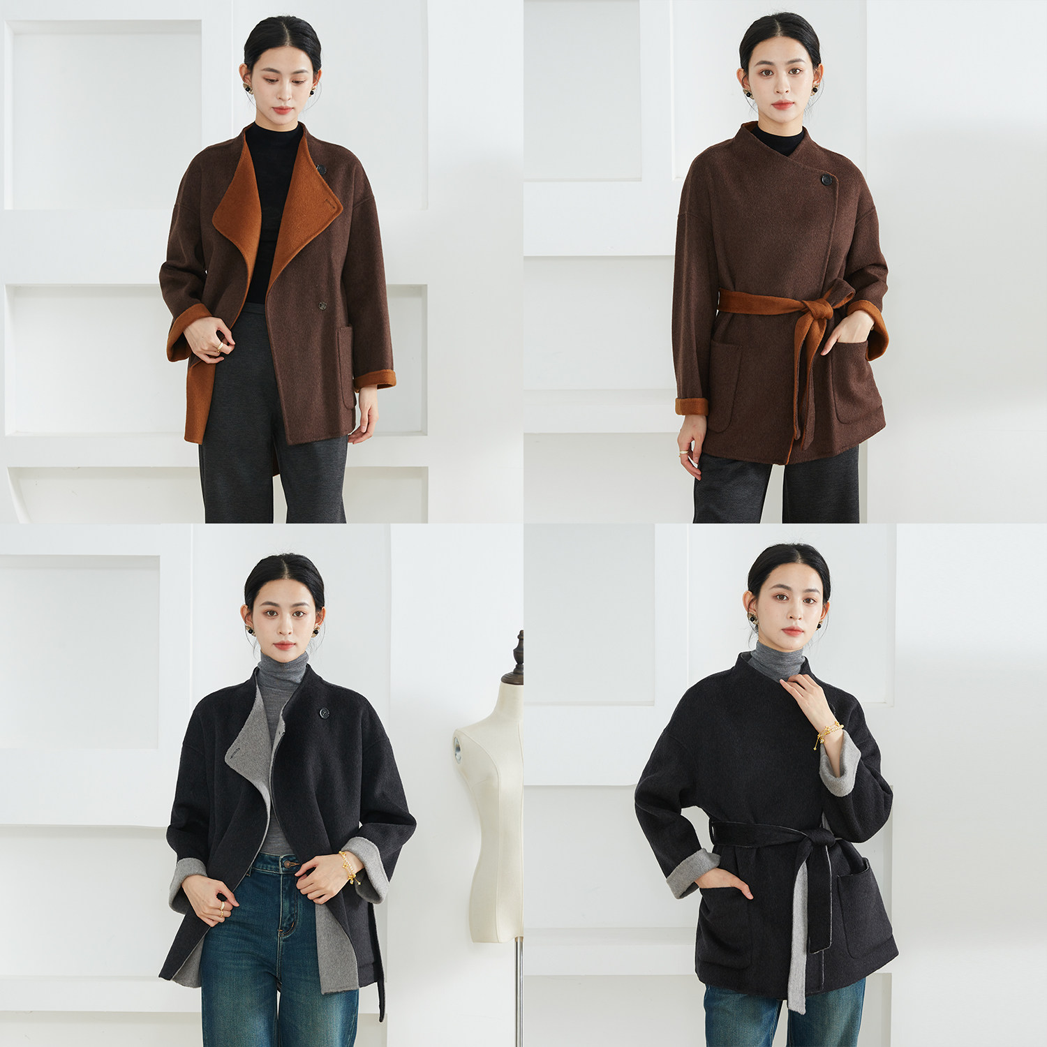 搭配腰带!极简廓形纯色双面呢羊毛大衣中长款长袖女毛呢外套N016