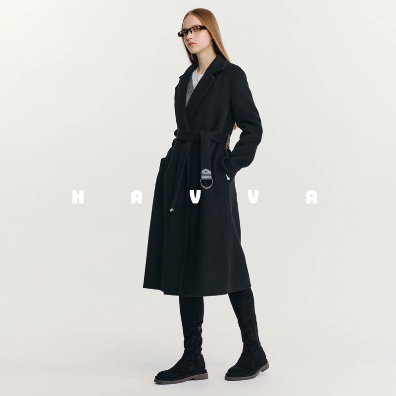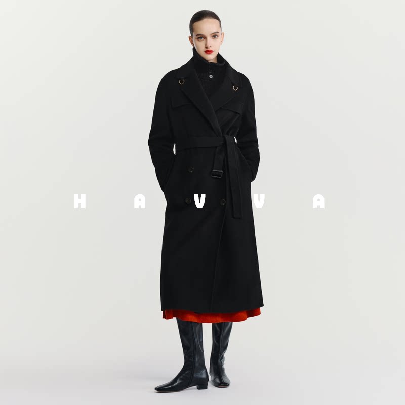 HAVVA中长款翻领毛呢大衣带腰带廓形显瘦女士外套2025冬季N3-4123