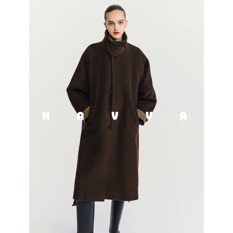 HAVVA高级感立领毛呢大衣带腰带中长款气质女外套2025冬季N3-4119