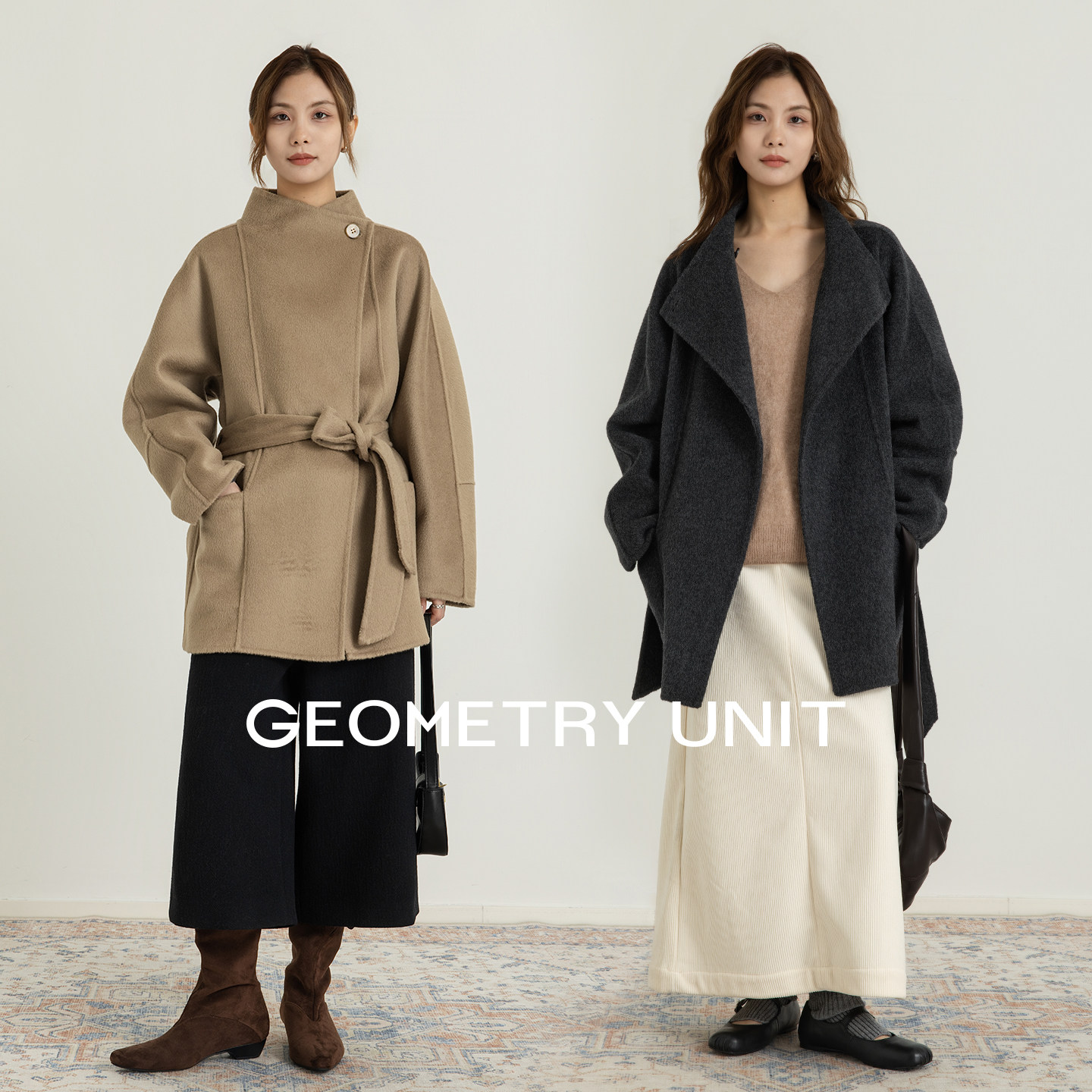 几何单元冬季中长款小个子羊毛呢子外套廓形系腰带双面毛呢大衣女