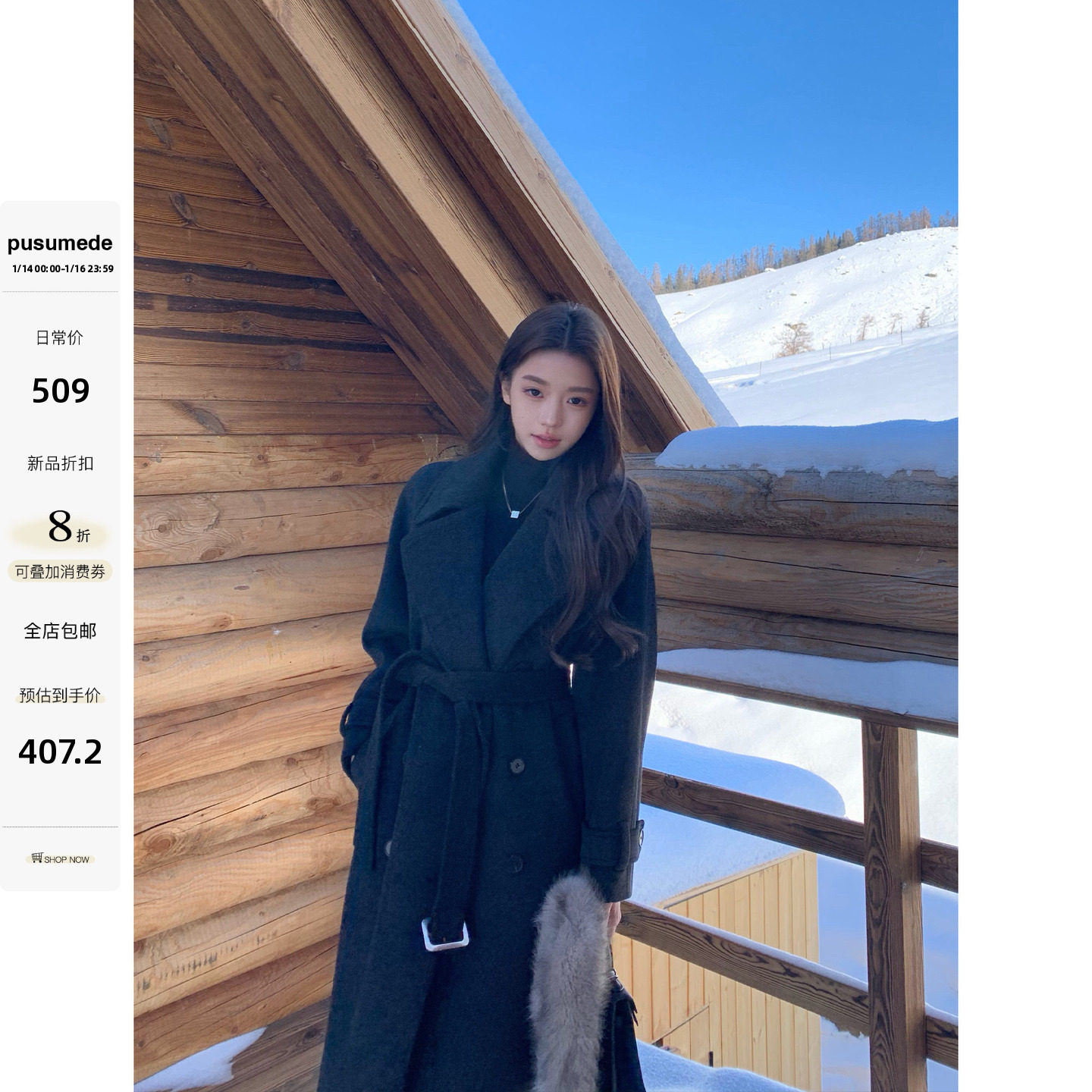 pusumede 雾都黎明 气质双排扣毛呢外套女经典可拆腰带中长款大衣