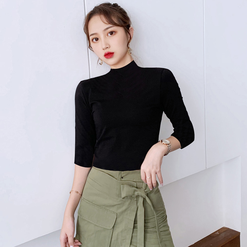 春秋季五分袖半高领修身T恤纯色内搭半袖体打底衫中袖女纯棉上衣