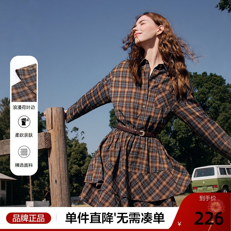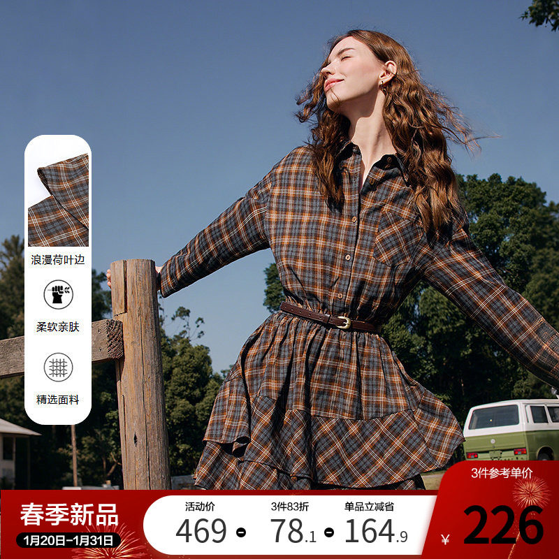 betu百图复古格子荷叶边连衣裙女2026年春季新款可拆卸披肩裙子