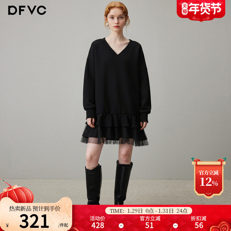 dfvc时尚休闲V领卫衣裙女2026年春季新款宽松连衣裙荷叶边小黑裙