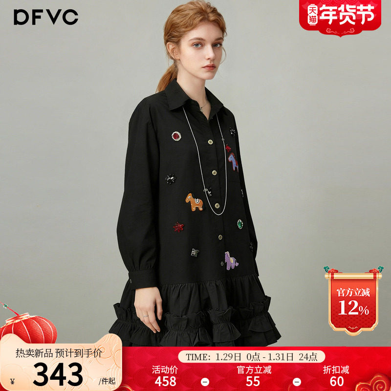dfvc黑色纯棉设计感小众衬衫裙女2026年春季新款荷叶边钉珠连衣裙