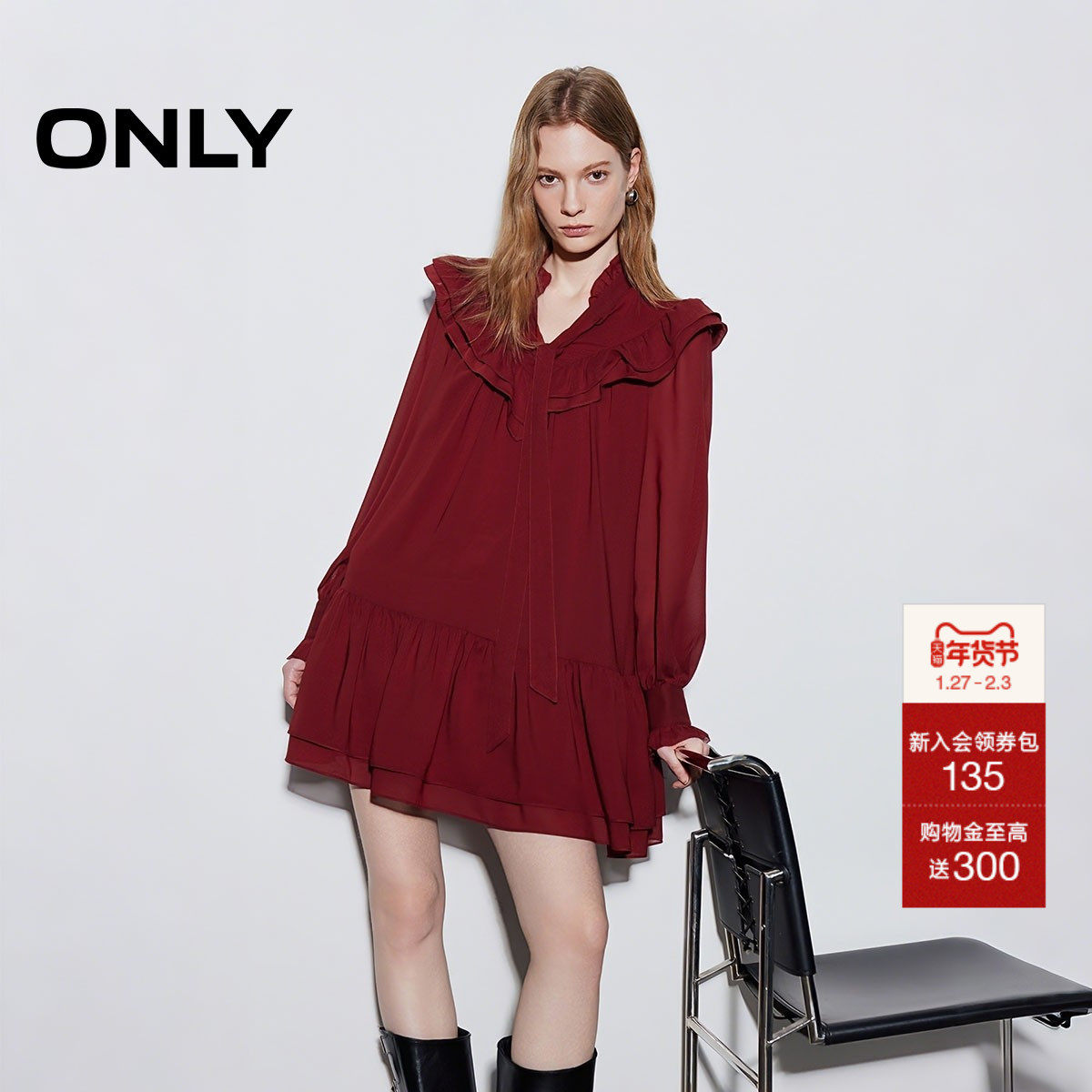 ONLY2026春季新款约会飘带层叠荷叶边垂顺A字红色短裙连衣裙女