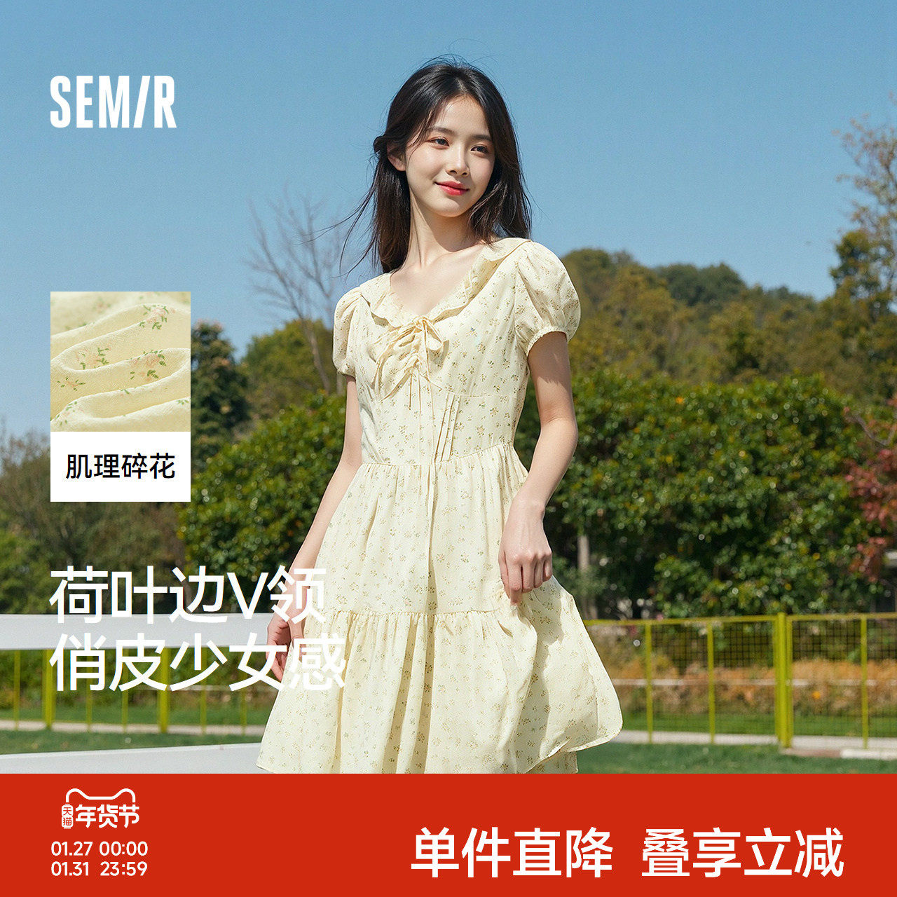 森马连衣裙女荷叶边V领2025新款肌理碎花裙浅春系Dress in light