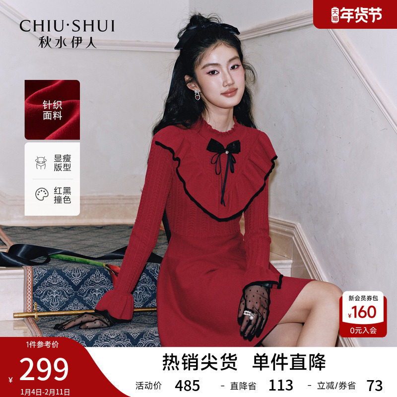 Elk Zoo女童针织连衣裙春秋款加厚红色优雅风荷叶边长袖裙子