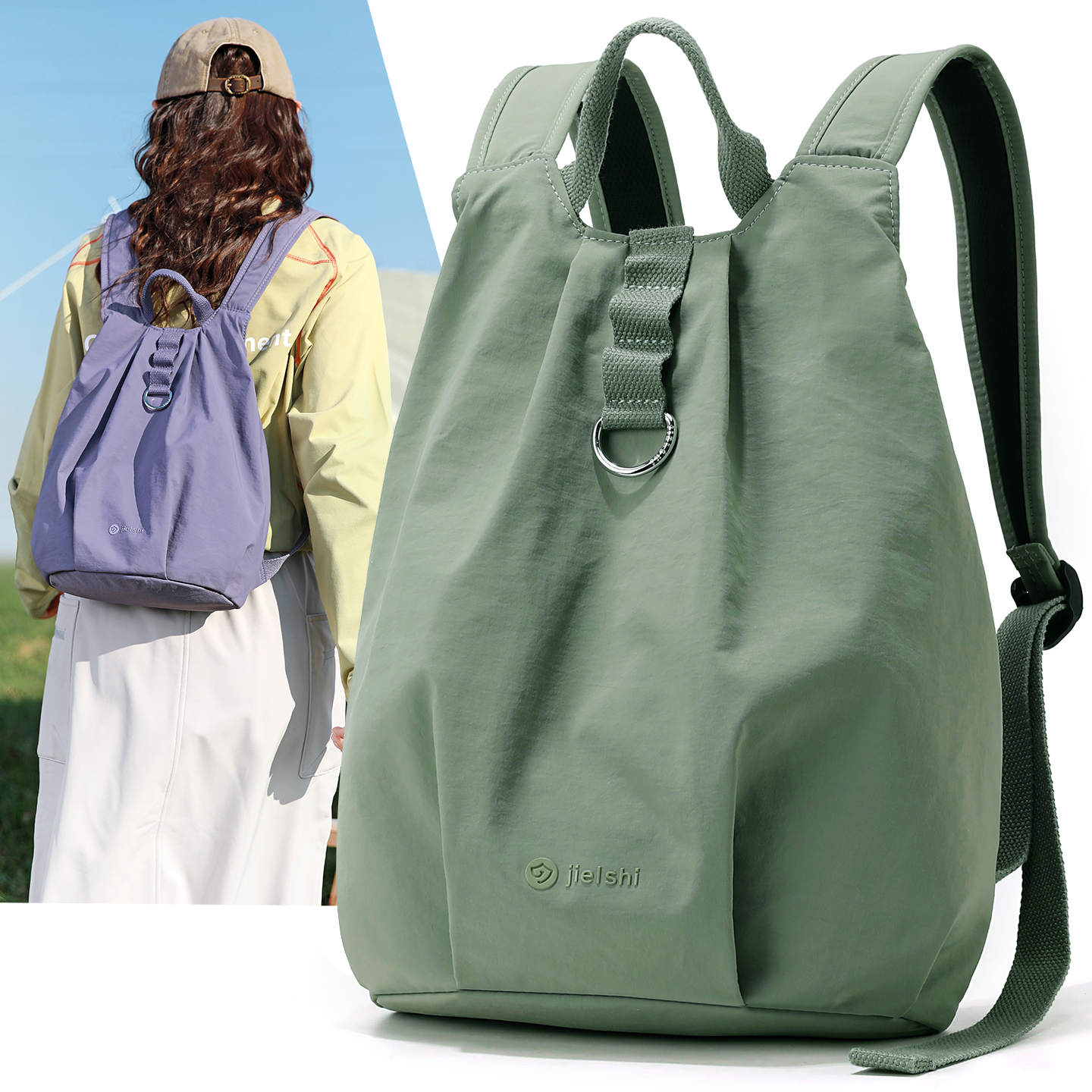casselini新品设计感褶皱木耳边抽绳户外度假大容量尼龙双肩包女