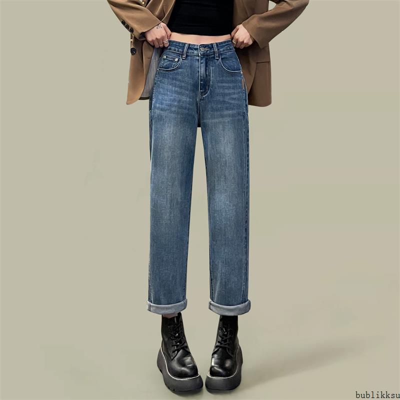 秋冬新款加绒加厚大码直筒宽松萝卜牛仔裤女胖妹妹高腰阔腿哈伦裤