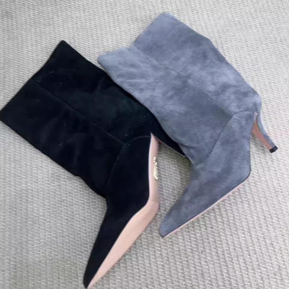 中筒靴女靴子秋冬季2025新款时尚百搭尖头短靴女高跟鞋绒面堆堆靴