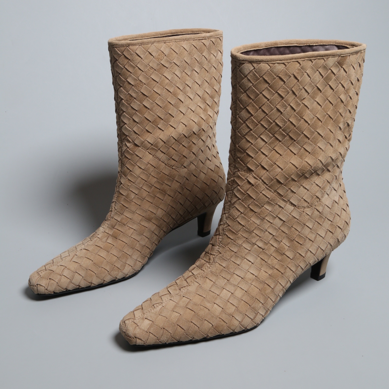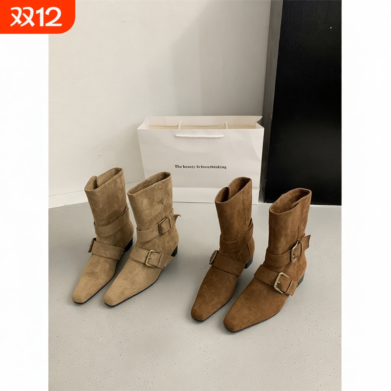 InkingPot彭姐 小众设计复古短靴方头麂皮西部靴中筒靴女靴秋新款
