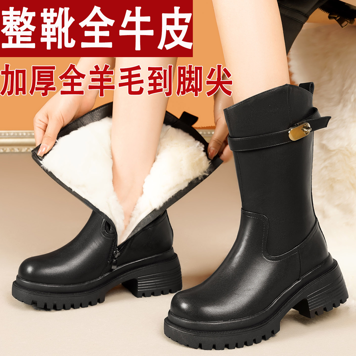 女女款真皮中筒靴女靴女鞋冬季新款加绒加厚皮毛一体靴子女士棉鞋