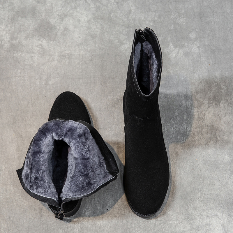 冬季圆头皮毛一体女鞋保暖加厚羊毛靴粗跟中筒靴女靴东北大棉鞋子