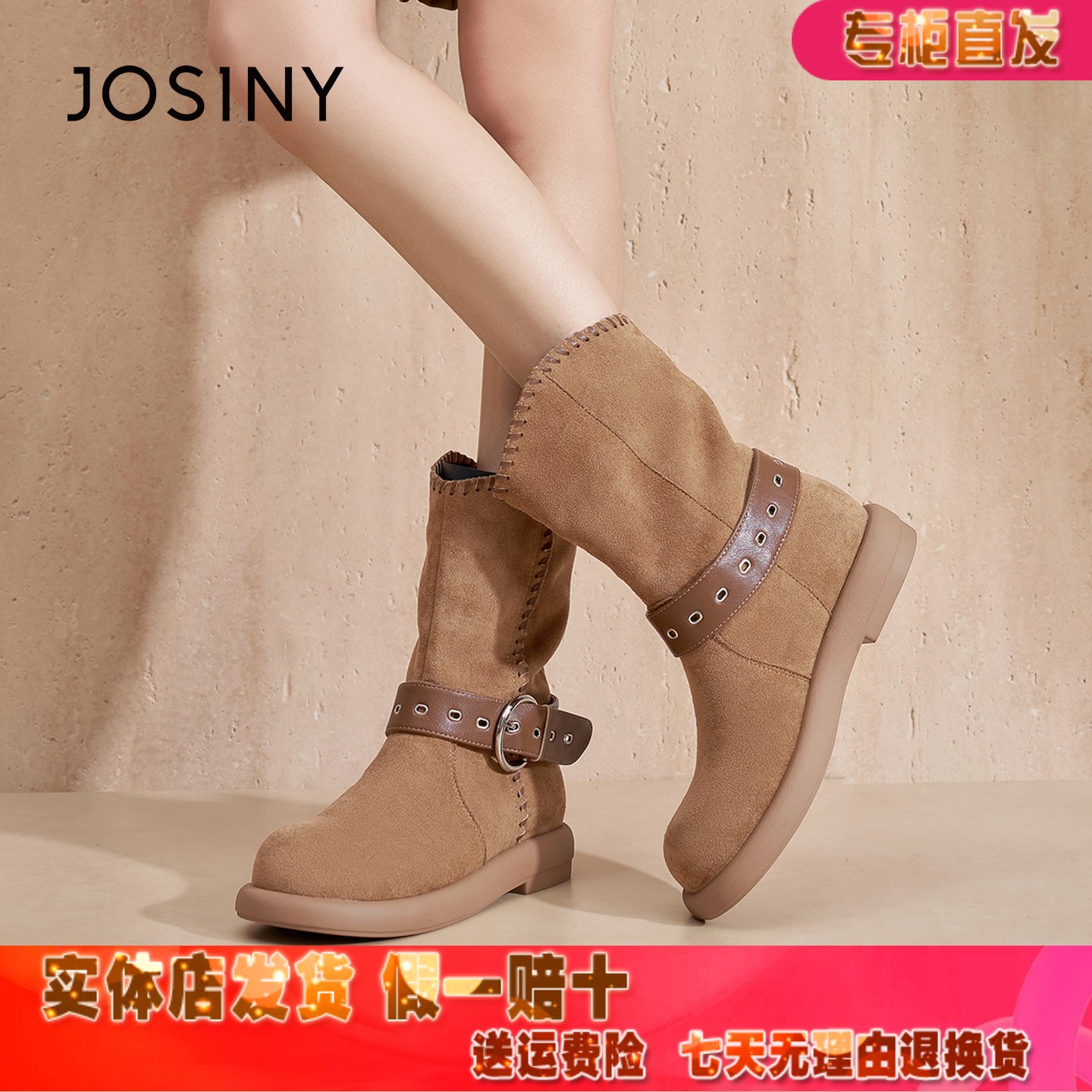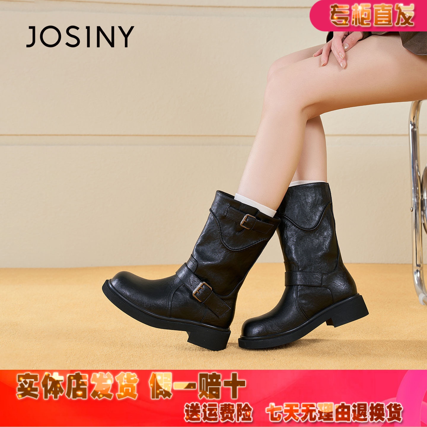 卓诗尼复古休闲百搭舒适粗跟皮带扣中筒靴女靴2025冬季新款时装靴