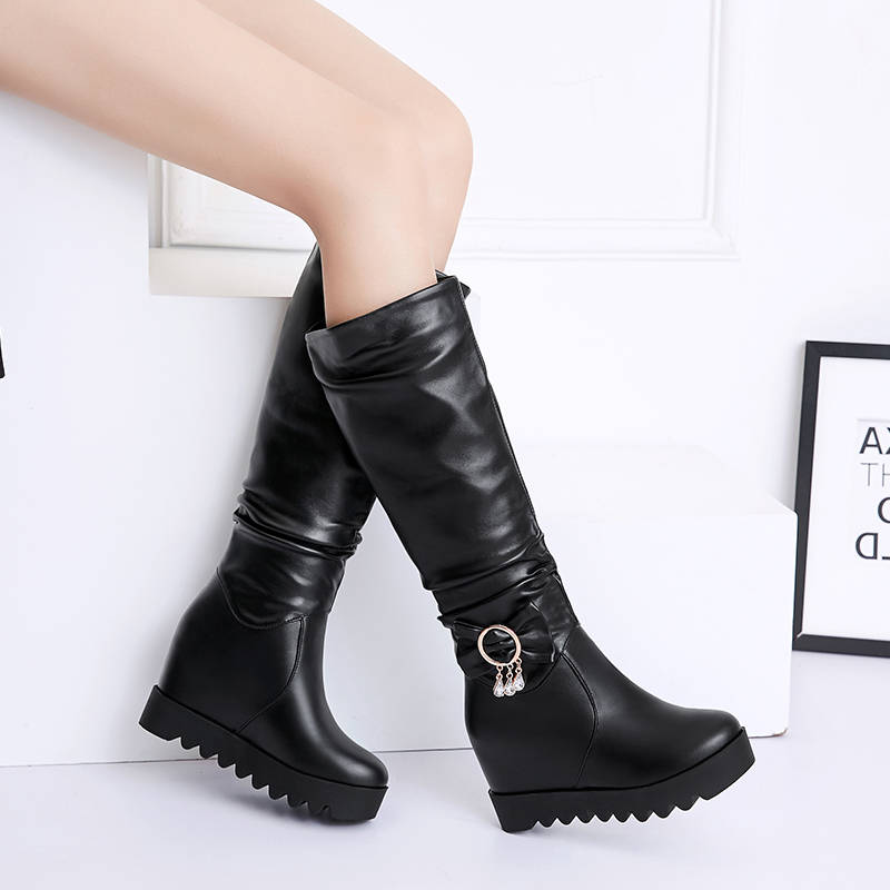 14CM小个子坡跟超高跟鞋增高不过膝长靴防水台厚底瘦腿中筒靴女靴