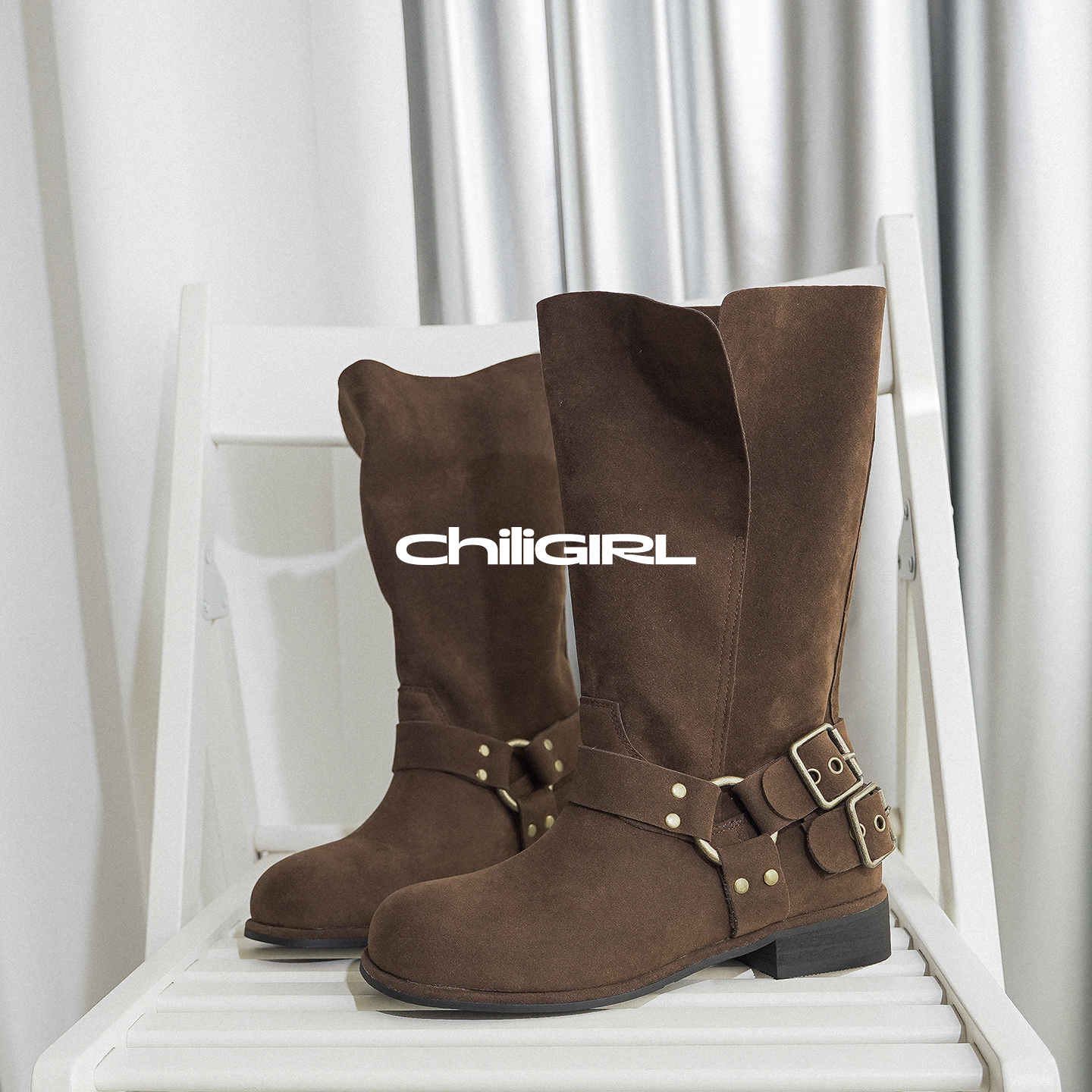 CHILIGIRL 韩国中筒靴女靴机车靴铆钉粗跟擦色做旧骑士短靴2025冬