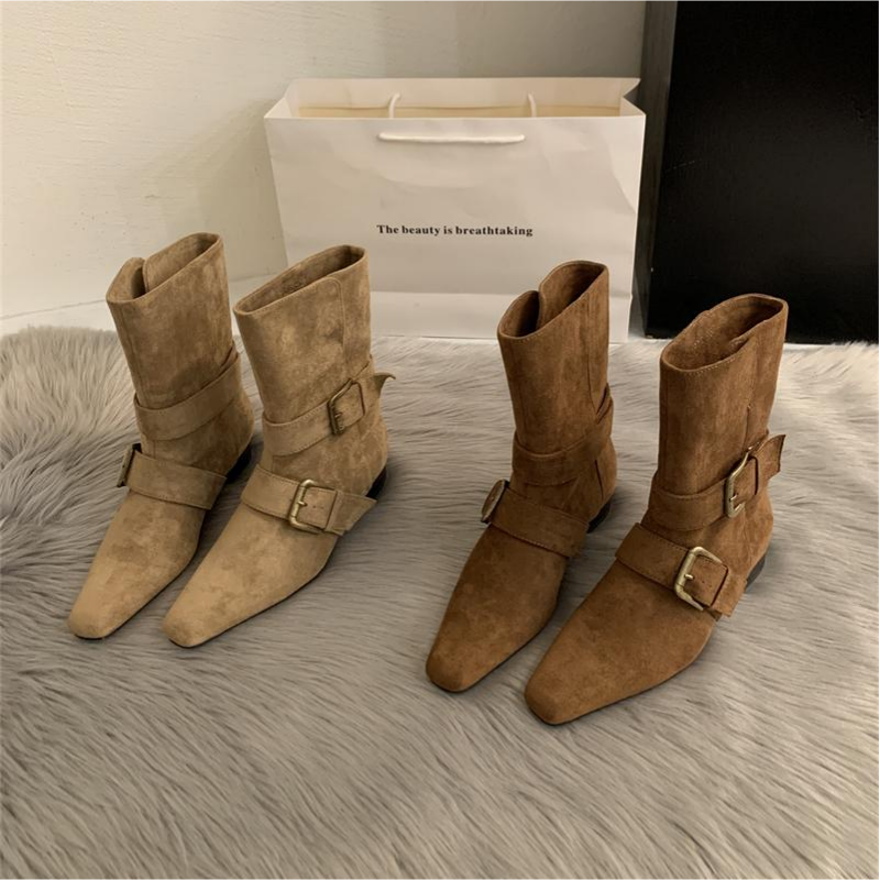 2025韩版新款小众设计复古法式短靴小方头西部靴麂皮中筒靴女靴子
