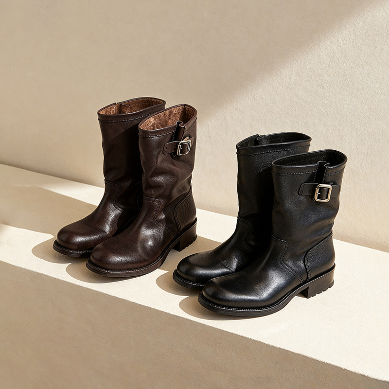 割草机老k 可调节皮扣西部靴骑士靴中筒靴女靴子复古2025秋冬新款