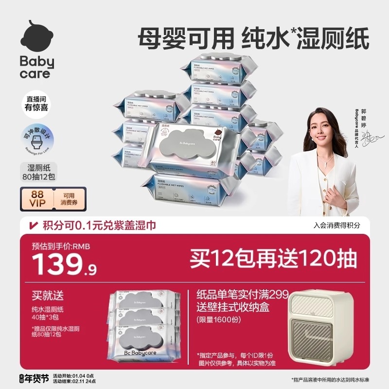 babycare纯水湿厕纸家庭实惠装洁厕湿巾纸擦屁股男女专用40抽80抽