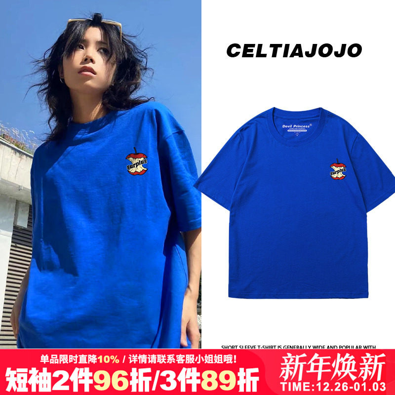 vibe宽松街头潮牌小众蓝色纯棉短袖t恤上衣bf风大码正肩半袖夏季