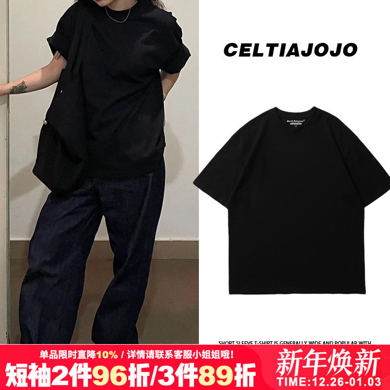 ovrsize慵懒风宽松纯色正肩短袖t恤bf风大码纯棉打底衫情侣装黑色
