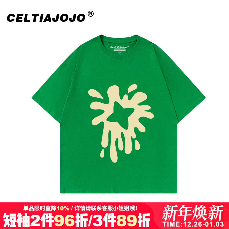 ulzzang设计感复古美式宽松街头bf风大码正肩绿色短袖t恤情侣装夏