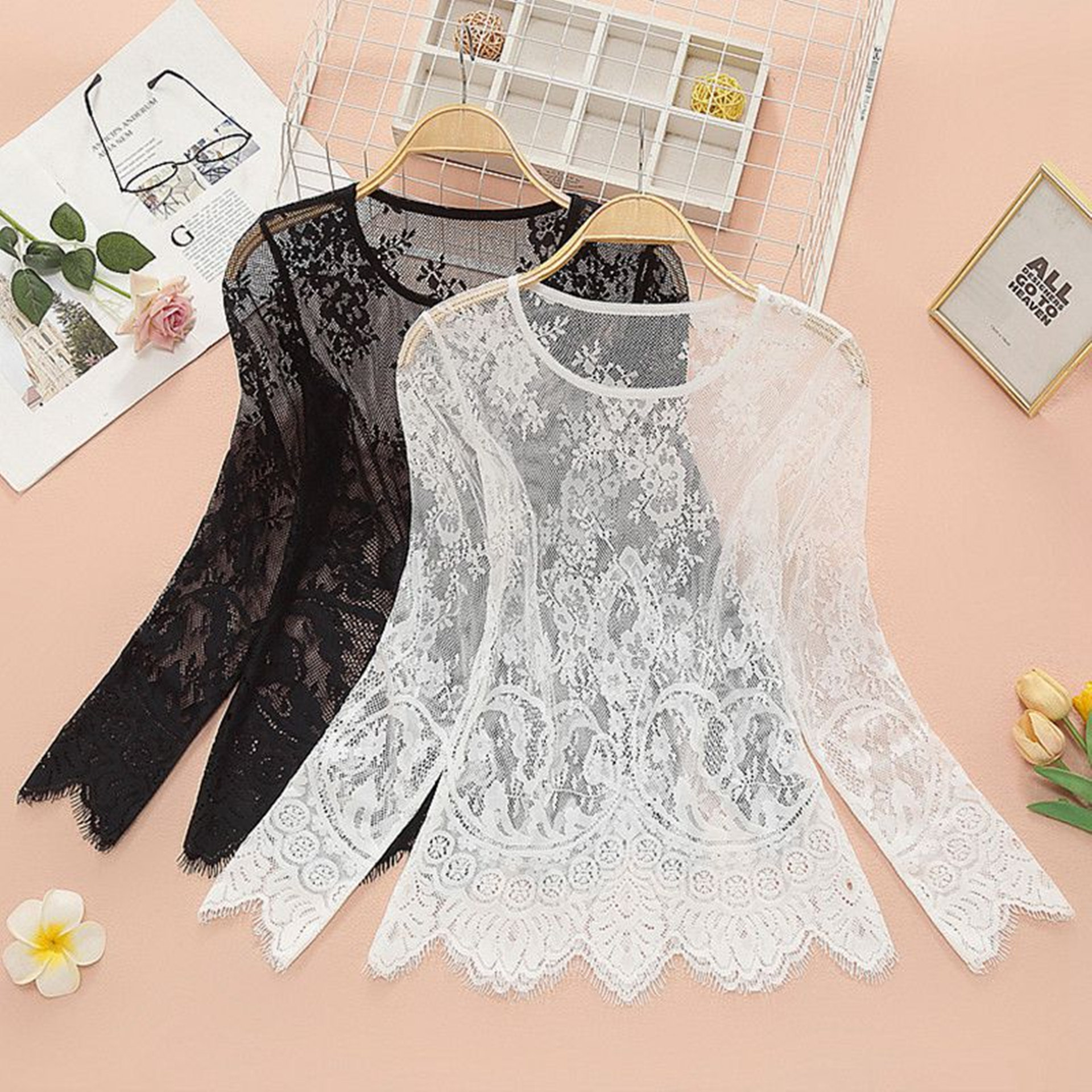 黑色通勤性感纱衣薄纱套头长袖内搭透视镂空蕾丝网纱上衣打底衫女