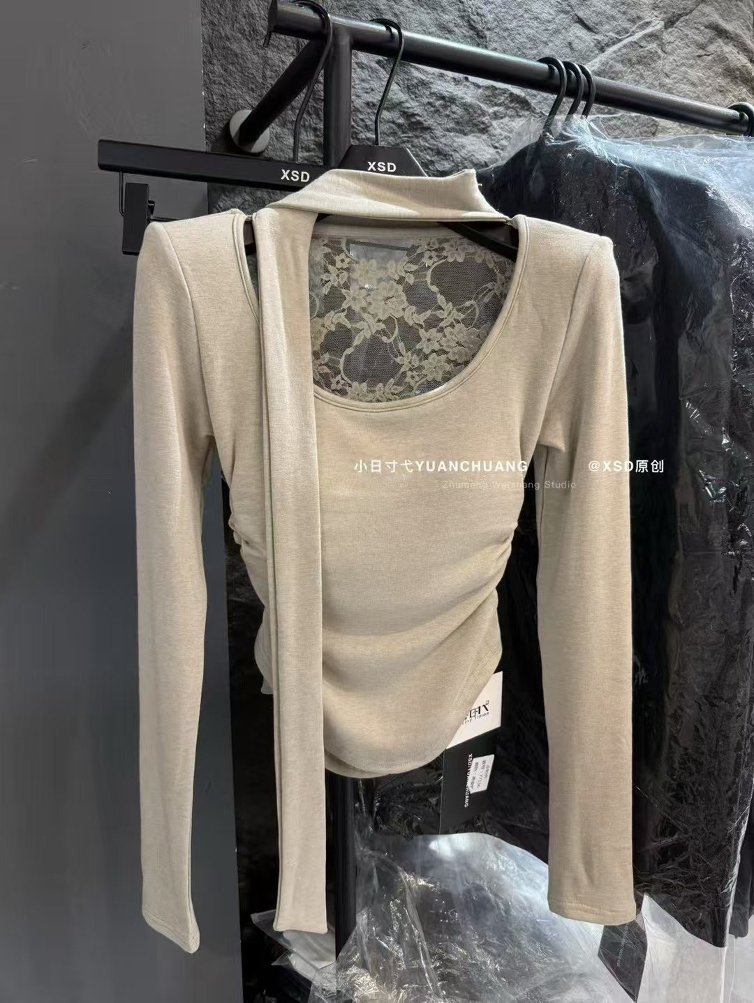 白鹿语镂空蕾丝长袖T恤2025秋新款优雅气质小众时尚修身显瘦上衣