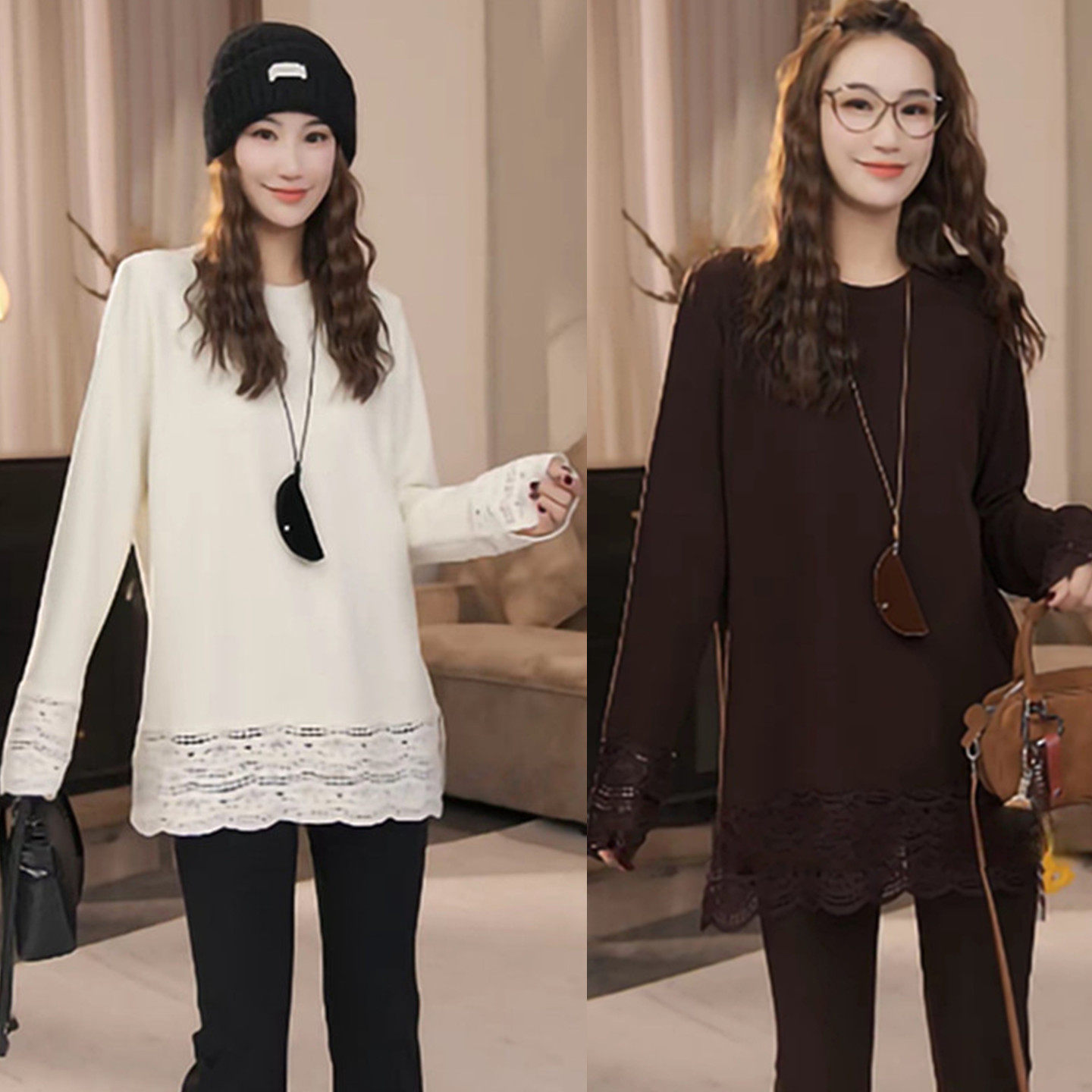 韩系下摆镂空蕾丝拼接长袖T恤女冬中长款加绒叠穿遮屁股内搭上衣