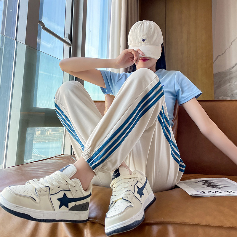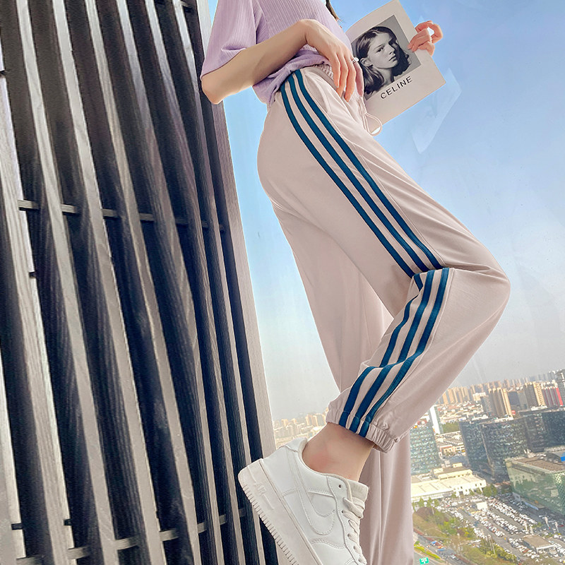 运动裤女冰丝速干夏季薄款卫裤束脚宽松跑步跳舞三道杠条纹休闲裤