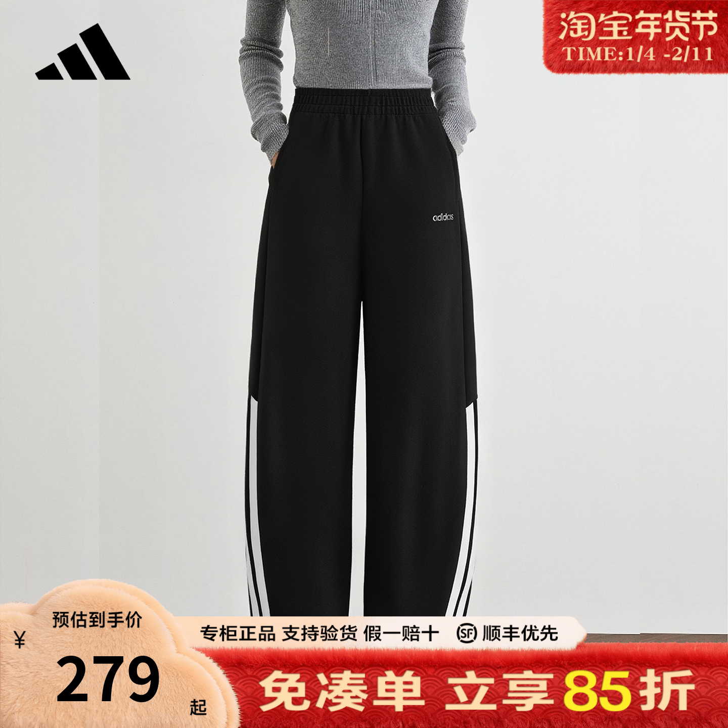 adidas阿迪达斯运动裤女款裤子三道杠卫裤休闲运动阔腿长裤KQ5359