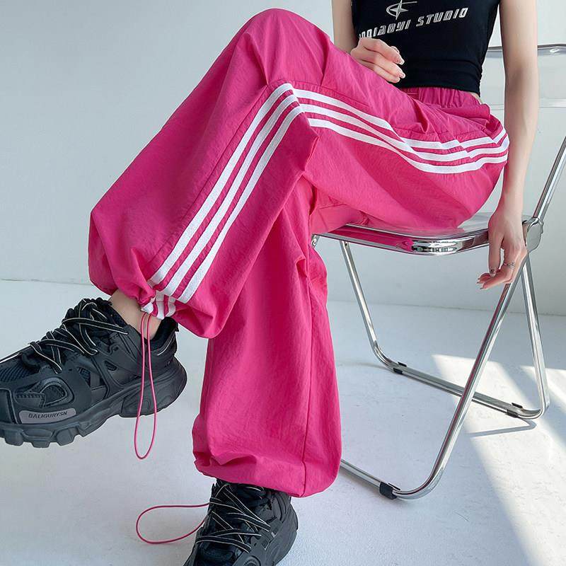 玫红色冰丝速干工装裤女夏季薄款高中学生三道杠条纹运动阔腿裤子