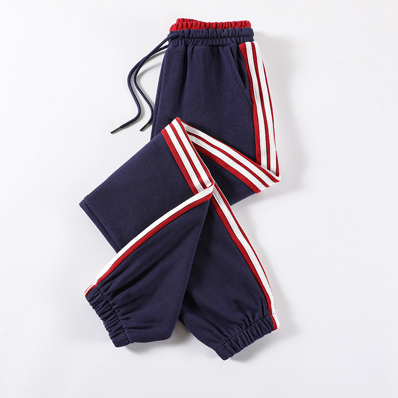 2023秋冬新款撞色拼接三道杠运动裤束脚裤加绒加厚宽松休闲卫裤女