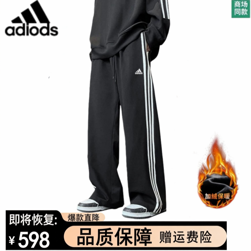 三道杠直筒裤男秋冬加绒加厚阔腿裤女宽松休闲长裤运动针织卫裤潮