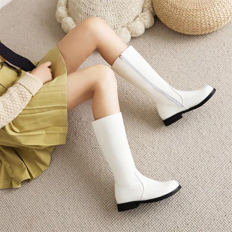秋冬韩版白色高筒靴小皮鞋平底侧拉链百搭复古少女学生圆头女靴子