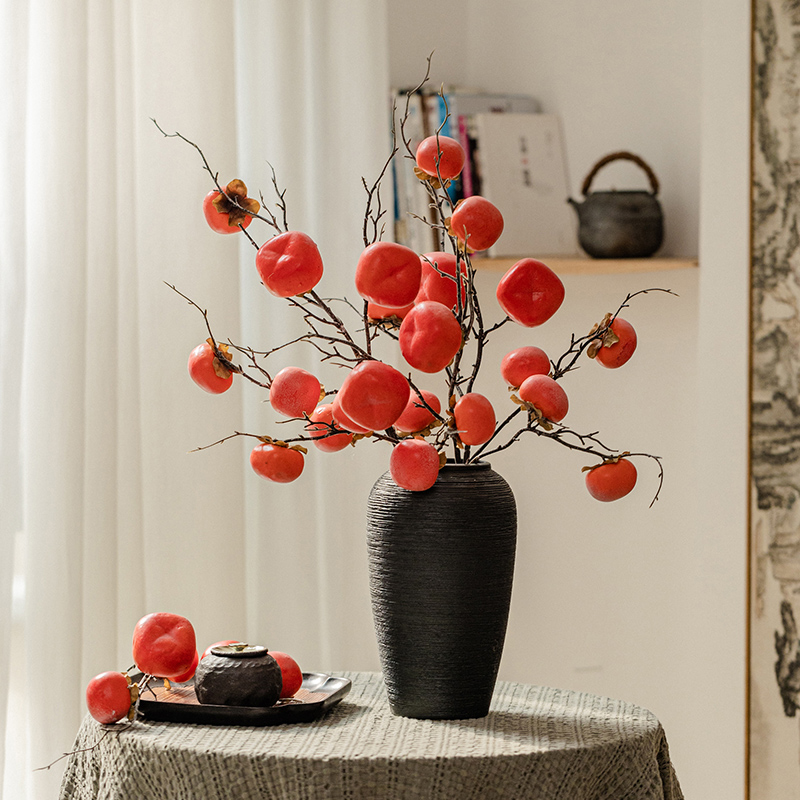 柿柿如意摆件柿子果实树枝仿真新款花瓶简约现代旺宅招财装饰假花