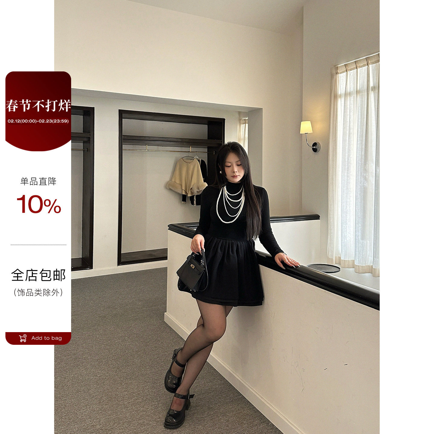 法式赫本小香风黑色半高领连衣裙2026秋冬款内搭外穿高级感蓬蓬裙