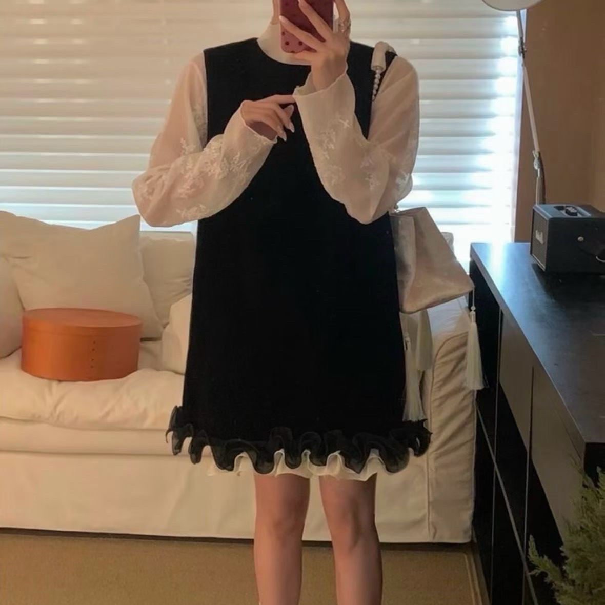 【迷迭庄园】Uena明星同款黑色堆堆领长袖拼接蓬蓬连衣裙附打底裤
