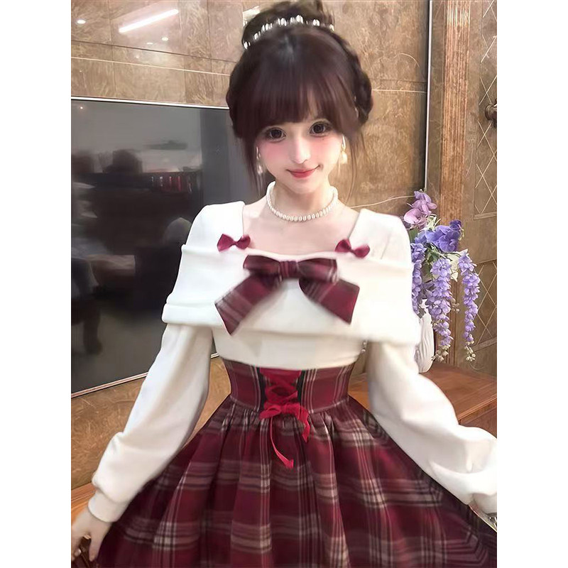 2026新年圣诞公主氛围感蝴蝶结格纹蓬蓬连衣裙秋冬可爱甜美收腰裙