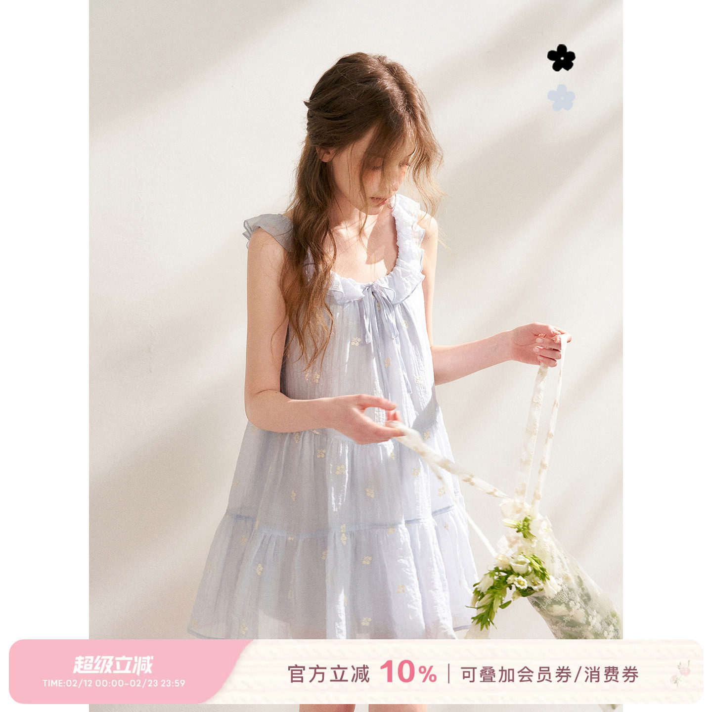 任敏同款 Kroche 天丝绣花 荷叶边大圆领A字蓬蓬连衣裙