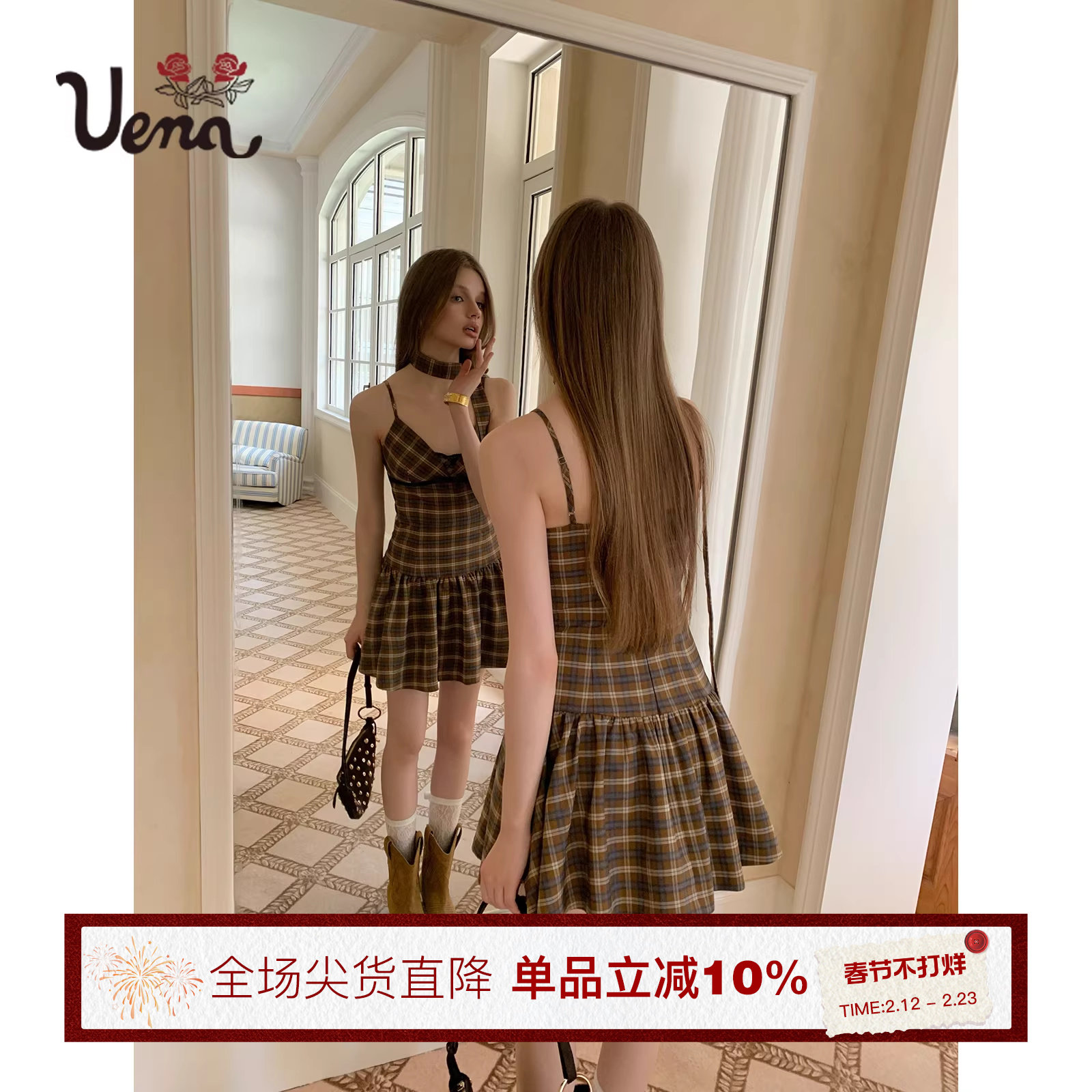 【风琴教堂】Uena格纹蕾丝花边蝴蝶结v领吊带蓬蓬连衣裙附围巾女