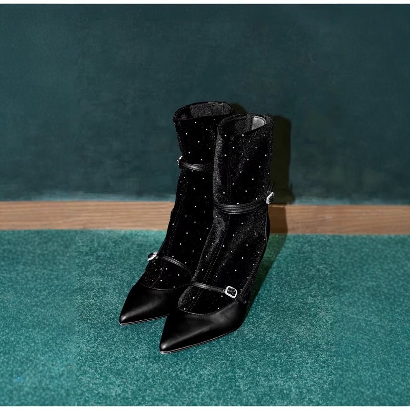 无敌璀璨星河战靴!her娘娘复古丝绒水钻尖头女日系女靴瘦瘦靴
