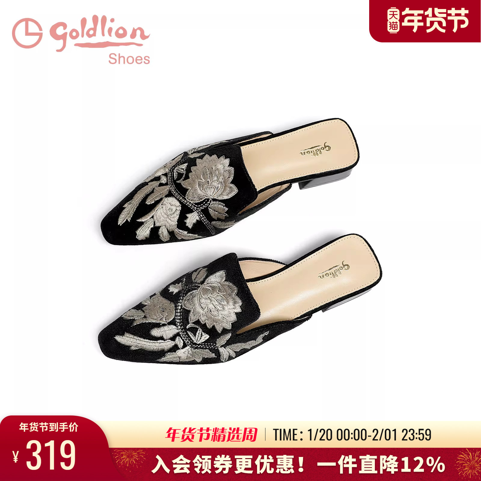 金利来2025春夏新款丝绒包头刺绣半拖鞋女国风绣花穆勒鞋外穿凉拖