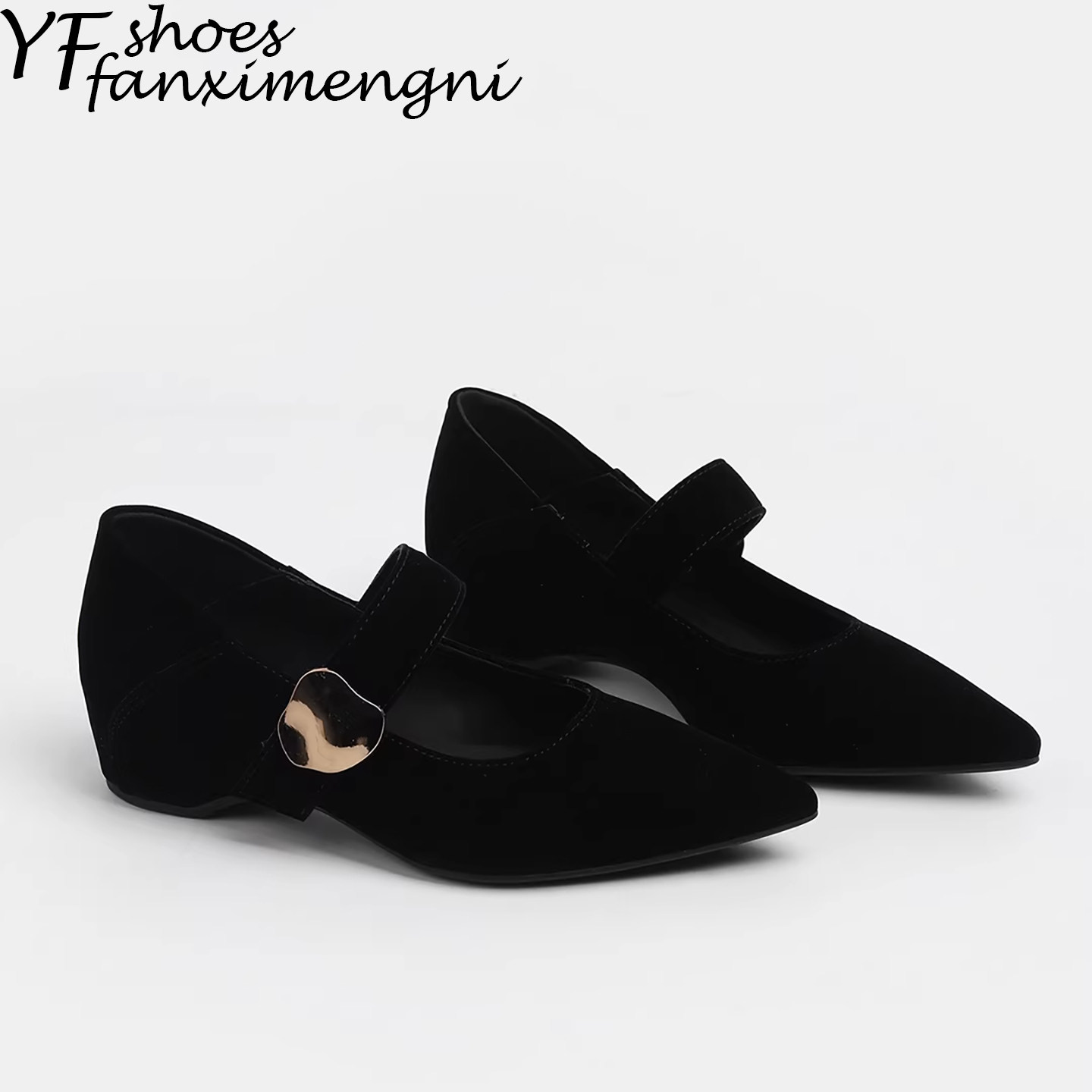 真皮~内增高法式尖头玛丽珍单鞋女2026新款异形金扣丝绒粗跟单鞋