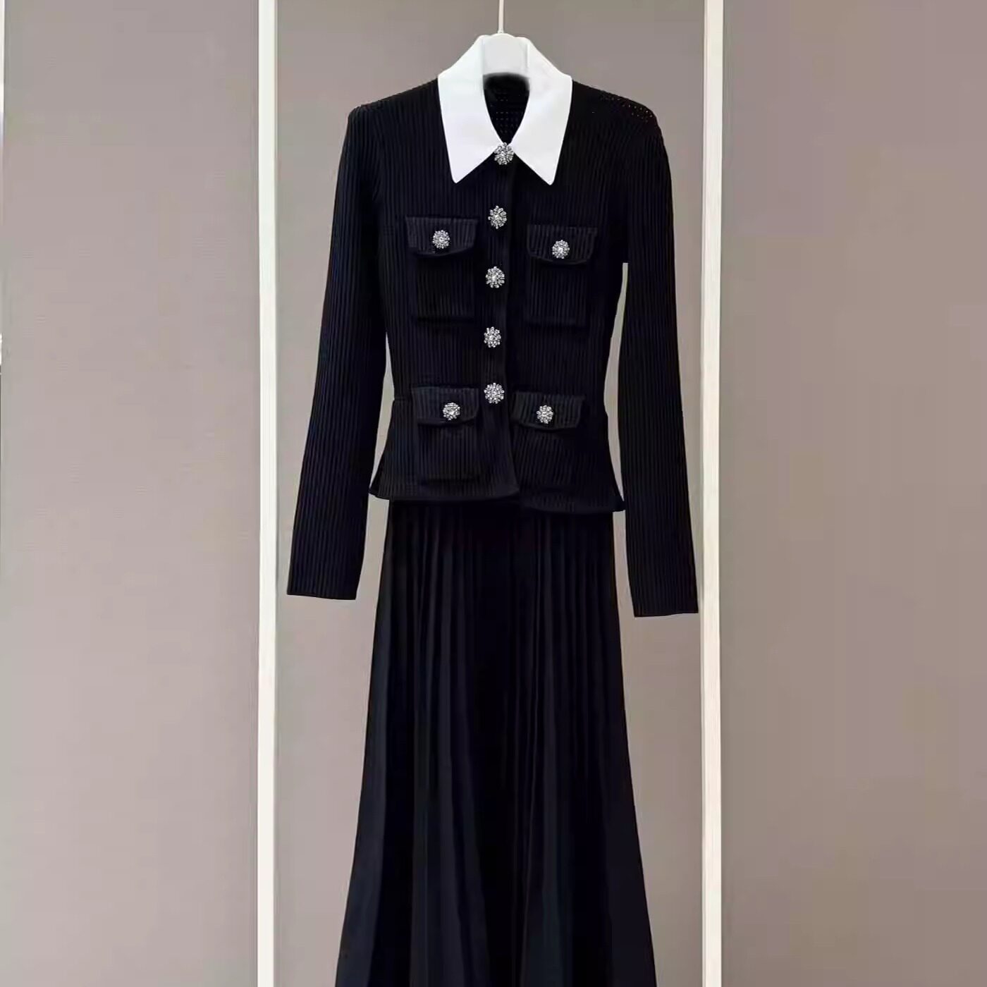 赵丽颖同款连衣裙小香风名媛钻饰翻领长袖百褶针织裙2023秋冬短裙