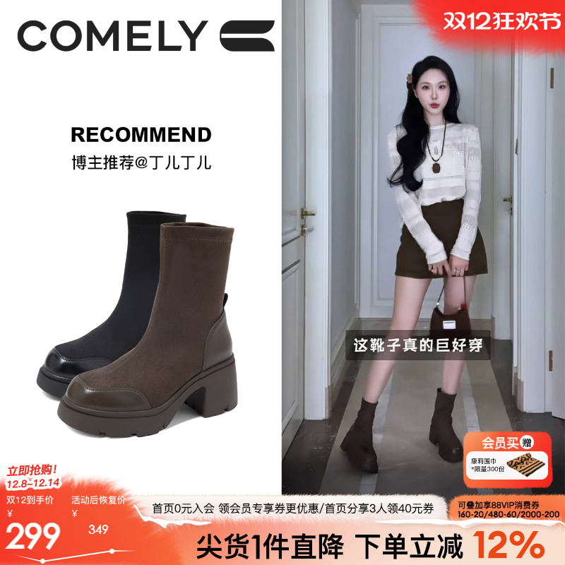 康莉弹力瘦瘦靴袜靴女秋冬小个子厚底复古圆头粗跟百搭短靴女靴鞋