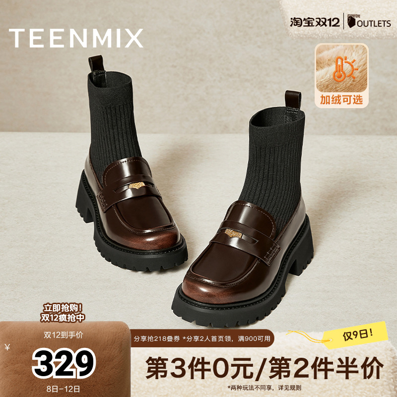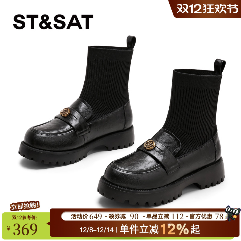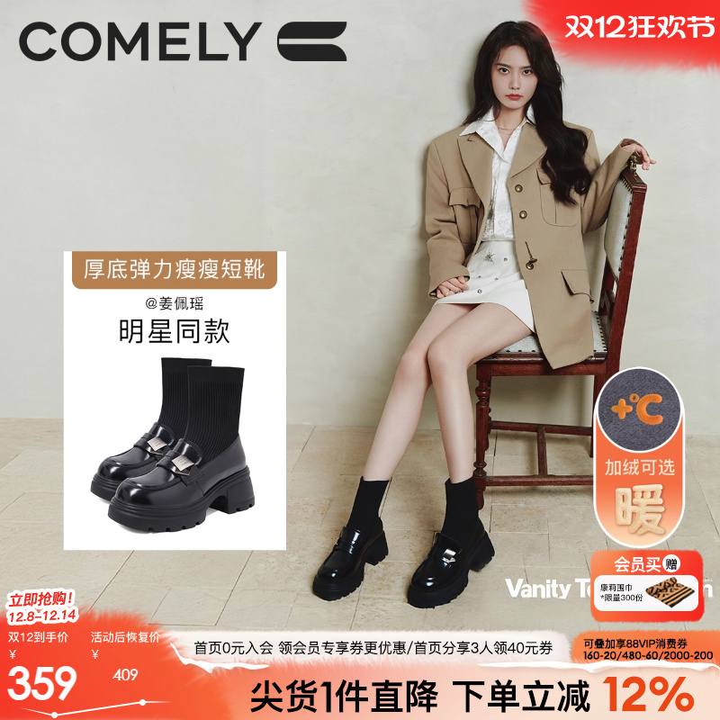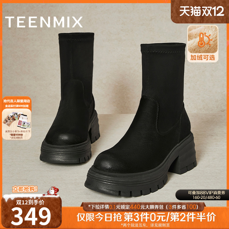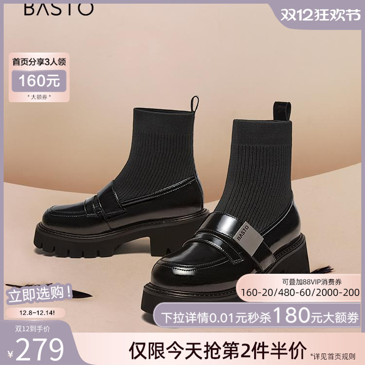 天美意复古英伦弹力靴乐福袜靴女厚底瘦瘦短靴冬新款COQ46DD4