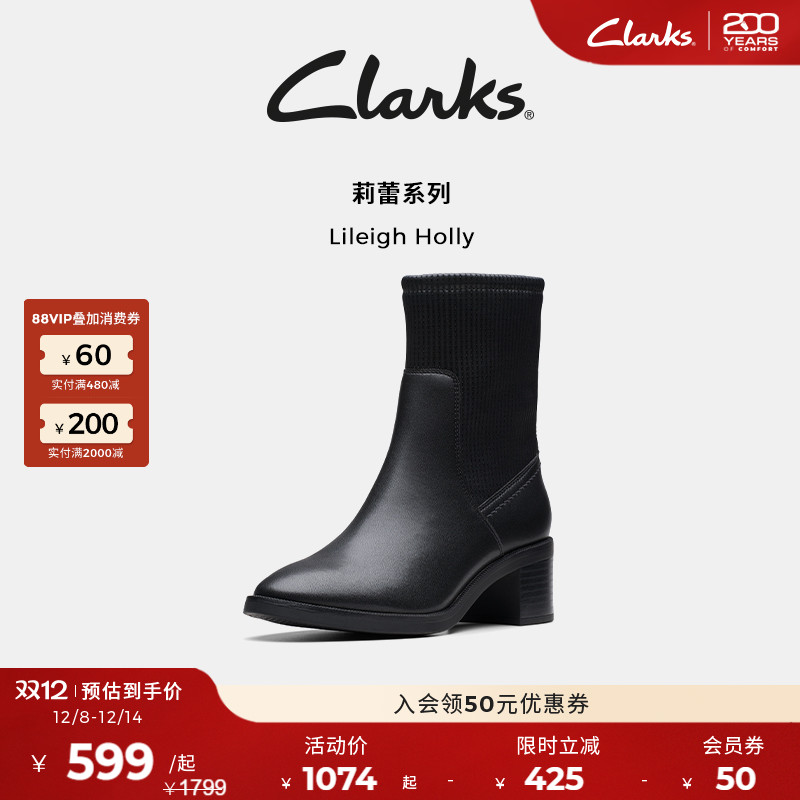 Clarks其乐Lileigh Holly秋冬新品优雅英伦粗高跟显瘦中筒袜靴女