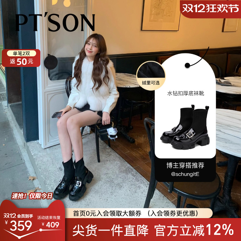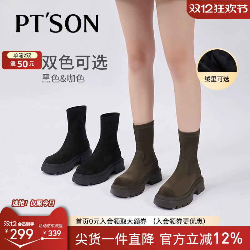 粉粉同款百田森英伦风袜靴女秋季新款袜子鞋绒面厚底短靴弹力靴子